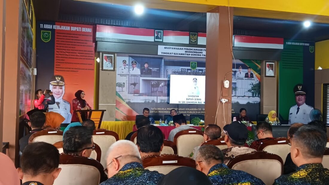 MUSRENBANG: Suasana Musrenbang Kecamatan Gunung Tabur saat Bupati Berau Sri Juniarsih Mas memaparkan prioritas pembangunan daerah di hadapan para kepala kampung dan pemangku kepentingan. (FOTO: GEORGIE/BENUAKALTIM)
