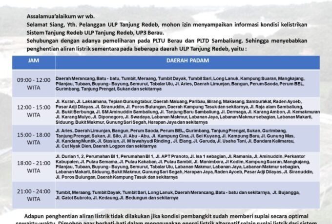 PLN UP3 Berau Bagi Jadwal Pemadaman Listrik
